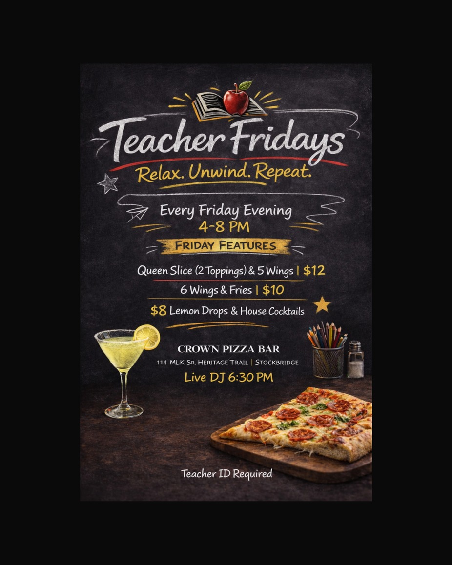 Join us every Friday from 4–8 PM for Teacher Fridays a well-deserved after-school wind-down designed just for educators.