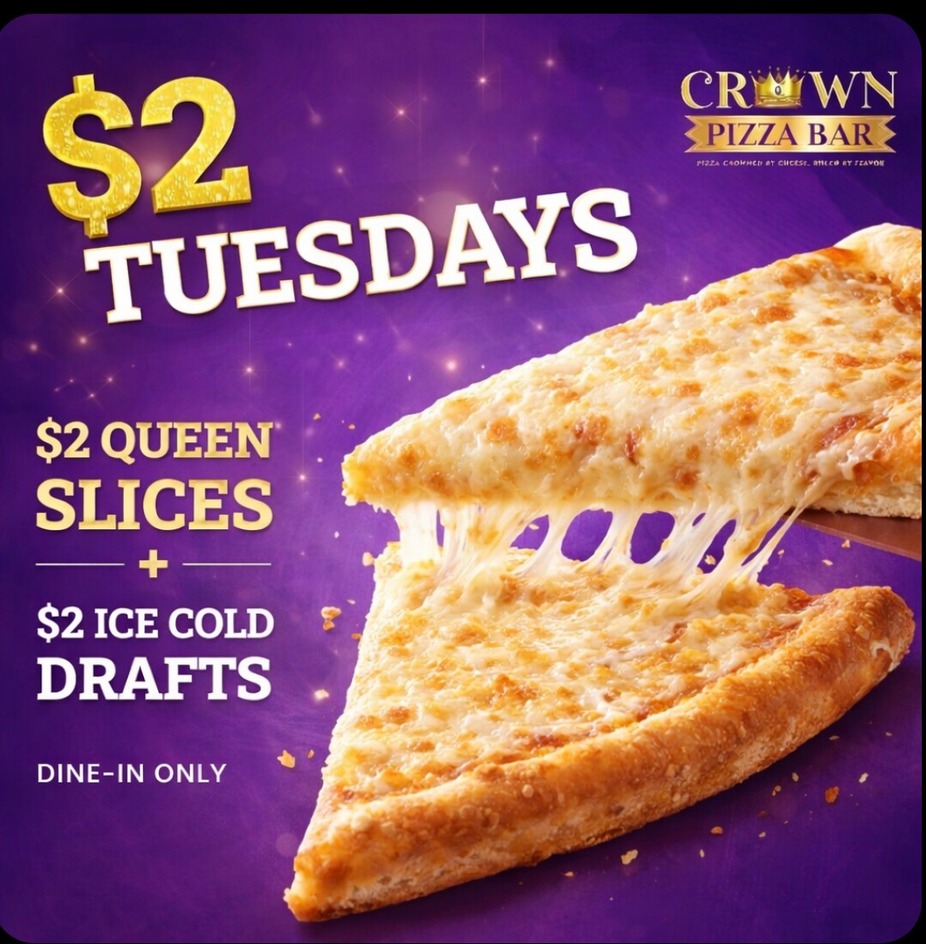 $2 TUESDAYS just hit different 👑 $2 Queen Slices $2 Domestic Drafts. $2 Shots (selected) Pull up, grab a slice, sip something cold, and run it back.
